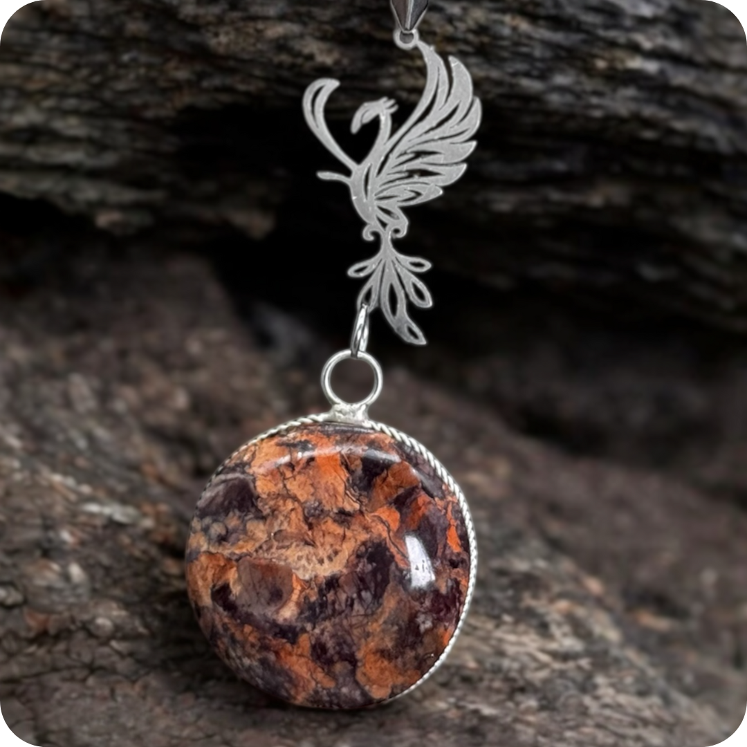 Significado: Al juntar la piedra de jaspe volcánica con el ave Fénix se crea una energía capaz de sostenerte en momentos difíciles, para que renazcas de la cenizas mas fuerte, valiente y resiliente.